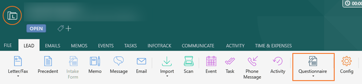 You will be able to use the Questionnaire button to open the Questionnaire from your Smokeball matter or lead.InstructionsGo to Smokeball Open a lead or matterClick on the ‘Questionnaire’ button. Click ‘Open’.Questionnaire button Open button
