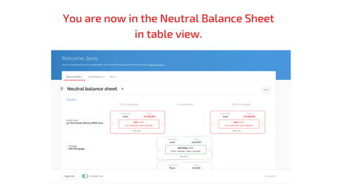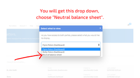 In preparation for your mediation you need to confirm that the dashboards have been populated by both parties. It is easy to flick back and forth between balance sheets, just click on "Balance sheets" and then click on "Other party".